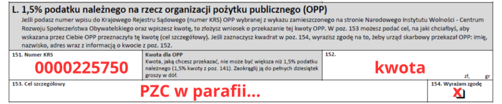 - w pkt. 153 wpisać cel szczegółowy, na przykład: „POMOC DLA DZIECI”, „POMOC BEZDOMNYM” czy „PZC w parafii…” (w ten sposób można wesprzeć Parafialny Zespół Caritas działający na terenie konkretnej parafii)